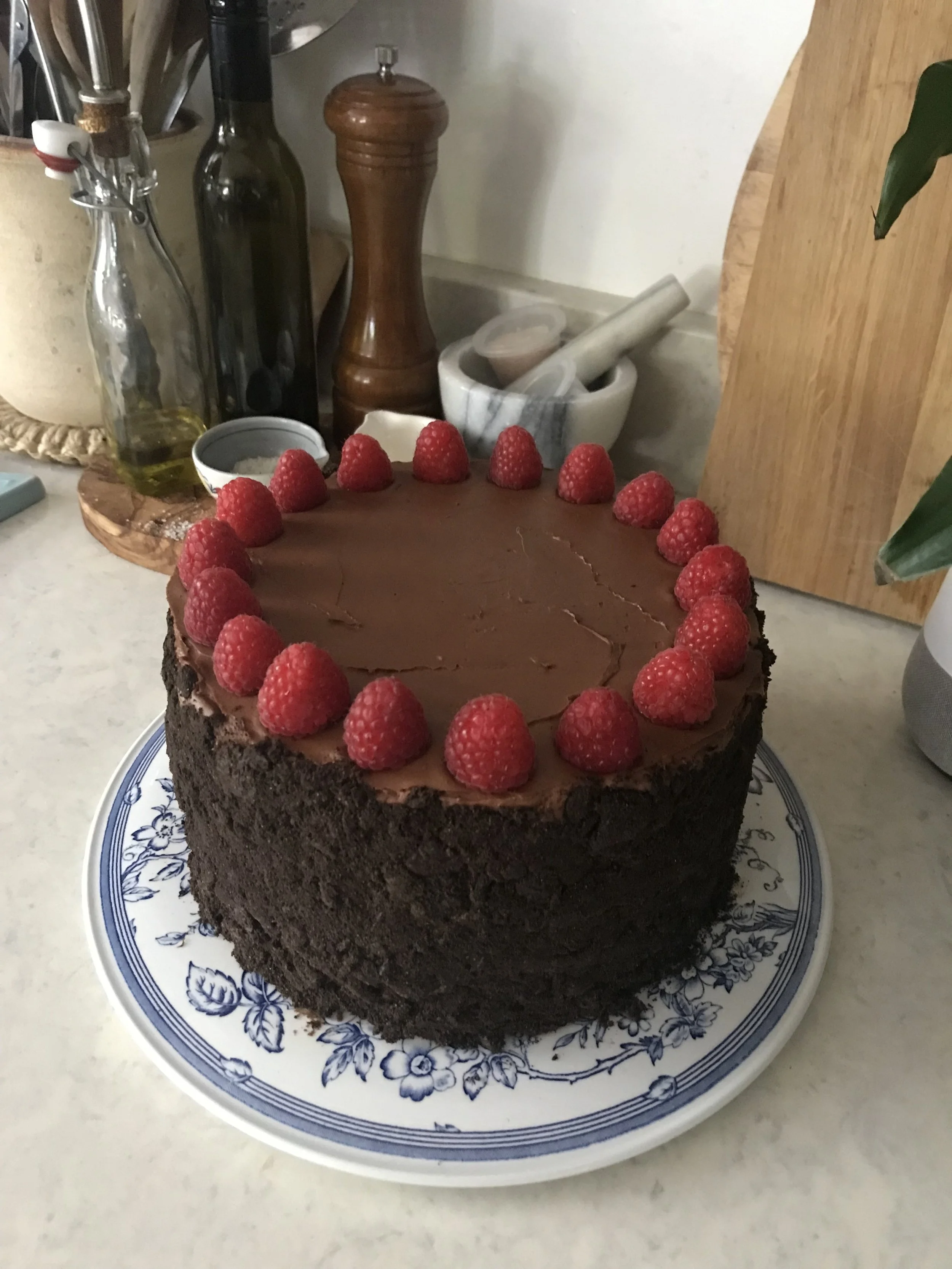 I crumbled oreo cookies (with the white stuff removed) and added them to the first layer (on top of frosting). Then I spread raspberry jam on top of the frosting between the other 2 layers. I also pressed more cookie crumbles into the sides. Then I added raspberries to the top.